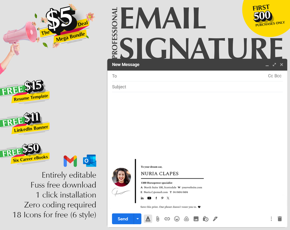 $5 never looked so rich. Grab $82 worth of products for only $5. Make this Email Signature (and a whole lot more) yours for only $5 by simply being part of our exclusive first 500 customer club.