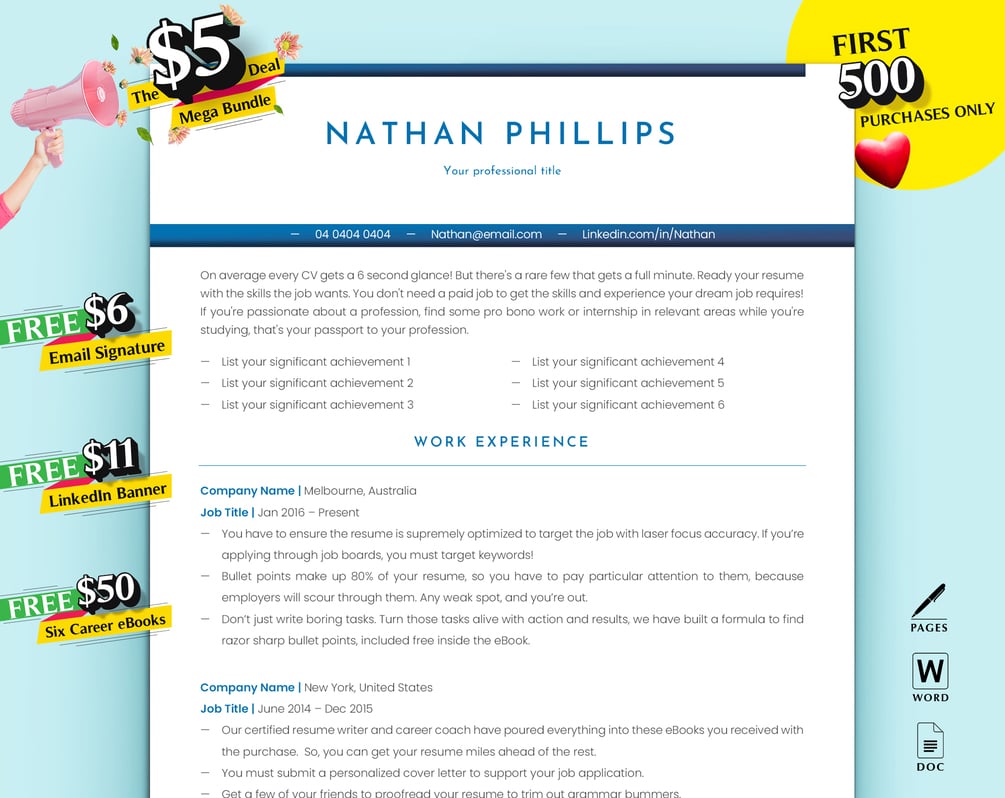 N.B. Only the above Resume Template files will be instantly ready for download. We'll ready rest of the "on offer" files and zip them all together, once we know your preference. You're free to choose any email signature, LinkedIn banner bundle from our store. We'll send an email after you complete a purchase. Over 15 LinkedIn Banner Bundle and Email Signatures to choose from š https://careercanvas.gumroad.com