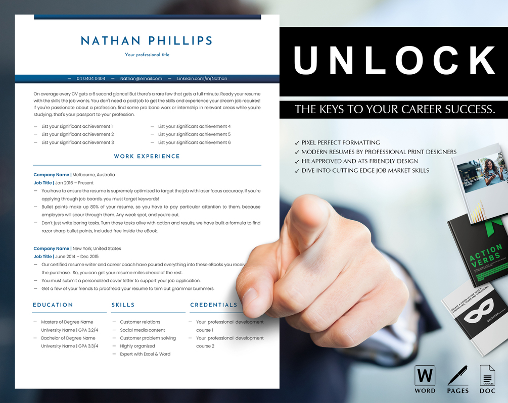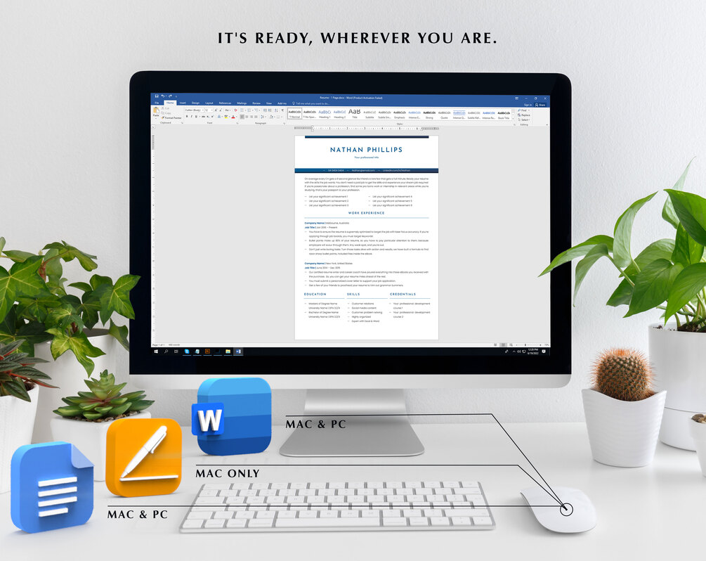 2. Cross platform compatibility with 100% technical accuracy is never possible, due to the inherent application limitations. We can state with full confidence the Google Doc and Pages resume files looks close to 99% or over as it appears on the mockup.But rest assured the mockup looks 100% like it does on MS Word.