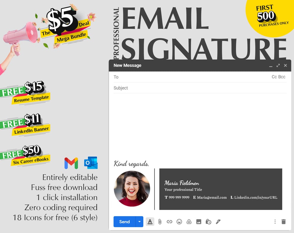 $5 never looked so rich. Grab $82 worth of products for only $5. Make this Email Signature (and a whole lot more) yours for only $5 by simply being part of our exclusive first 500 customer club.