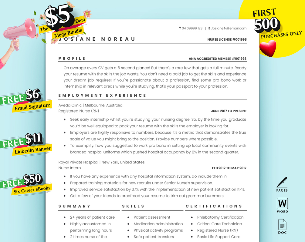 N.B. Only the above Resume Template files will be instantly ready for download. We'll ready rest of the "on offer" files and zip them all together, once we know your preference. You're free to choose any email signature, LinkedIn banner bundle from our store. We'll send an email after you complete a purchase. Over 15 LinkedIn Banner Bundle and Email Signatures to choose from š https://careercanvas.gumroad.com