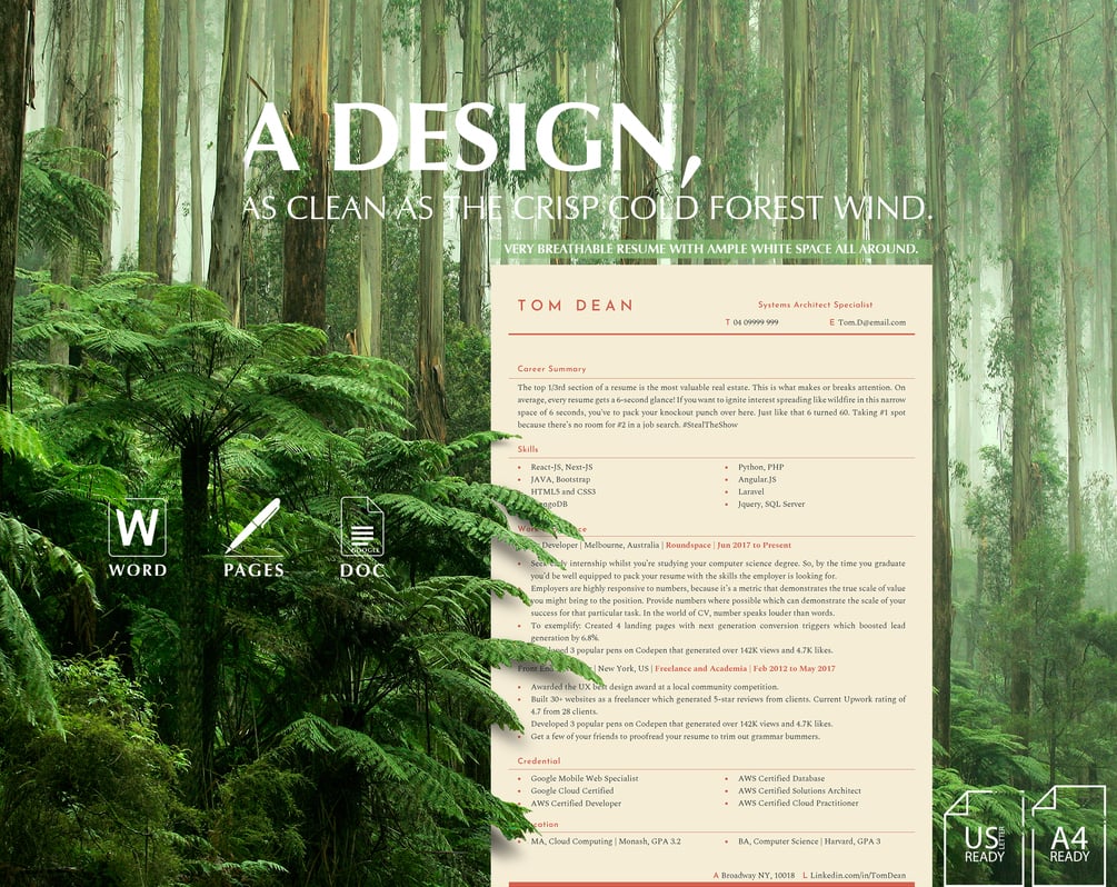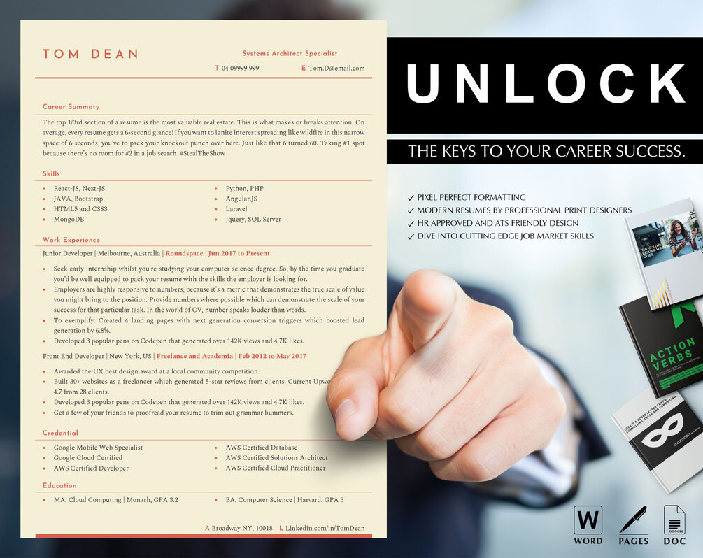 2. Cross platform compatibility with 100% technical accuracy is never possible, due to the inherent application limitations. We can state with full confidence the Google Doc and Pages resume files looks close to 99% or over as it appears on the mockup.But rest assured the mockup looks 100% like it does on MS Word.